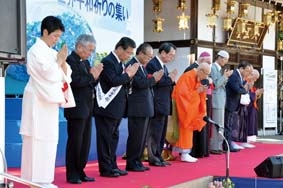 続いて国内外の各教宗派の代表者が登壇。平和の鐘が打ち鳴らされる中、世界各地の紛争の一刻も早い終結と平和の訪れを祈って黙祷が捧げられた。また、今回は特に、東日本大震災の犠牲者に対しても、参加者一同により、深い哀悼が捧げられた(写真)。