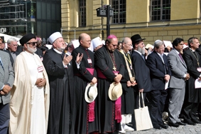 今回のテーマは「共存する運命」で、集いは九月十一日から十三日までの日程で開催された。十一日は、開会式に先立ちマルシュタルプラッツ広場にはクリスティアン・ヴルフドイツ連邦共和国大統領を迎えて「九・一一同時多発テロ追悼式典」が行われた。出席した全宗教者が犠牲者に黙祷を捧げ(写真・上)、鎮魂の鐘が打ち鳴らされる中、犠牲者を悼む焼香が行われた。