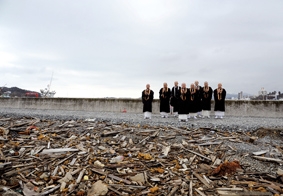 慰霊法要に先だって、阿純孝天台宗宗務総長はじめ天台宗参務は、甚大な被害を受けた鹿折地区の気仙沼港において読経回向し、犠牲者の冥福を祈った。