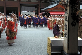 五月十一日、比叡山延暦寺根本中堂ご宝前において「祖師先徳鑽仰大法会総開闢奉告四箇法要」が半田孝淳天台座主猊下大導師のもと、厳かに執り行われた。同法要は宗祖伝教大師・慈覚大師・相応和尚・恵心僧都の四祖師先徳の遺徳を鑽仰する十年に亘る大法会の開闢をご本尊薬師如来に告げるもの。全国の天台宗要職者ならびに檀信徒が随喜。法要出席者約百六十名は、共々に大法会円成に向けての決意を新たにした。