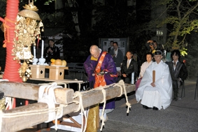 延暦寺書院から日吉大社氏子の担ぐ御輿が出発し、根本中堂前広場に鎮座されたのち、馬渕直樹宮司が祝詞を奏上。続いて阿純孝天台宗宗務総長(大法会事務局局長)が導師となり、大法会の無事円成を願って法要が行われた。