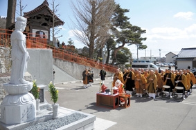 東日本大震災から三年目を迎え、天台宗では、十日、十一日に福島県本宮市の観音寺(矢島義謙住職)と宮城県気仙沼市の觀音寺(鮎貝宗城住職)において「東日本大震災物故者三回忌慰霊並びに復興祈願慈光観音開眼供養法要」を厳修した。半田孝淳天台座主猊下のご名代として森川宏映探題大僧正(延暦寺一山真藏院住職)が大導師を勤め、両日の法要には、天台宗からは各教区宗議会議員・宗務所長を始めとする諸大徳、被災地東北を始め全国の震災犠牲者の遺族、被災者など有縁の人たち多数の参列があった。