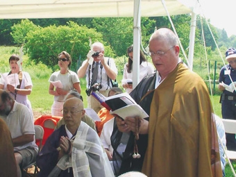 六月八日、米国ニューヨーク州イースト・チャダムの「天台宗ニューヨーク別院」で本堂の地鎮祭が厳修され、日本天台宗来賓や、檀信徒はじめ関係者約七十名が随喜した。同別院の聞真・ポール・ネエモン住職は一九九五年に「カルナ・天台・ダルマセンター」を設立。以来、家畜飼料小屋を改造した仮本堂で、仏教に関してのディスカッションや、坐禅止観を毎週欠かさず行なってきている。本堂は明年に完成の予定であり、天台宗では初めてアメリカ本土での本格的な開教のスタートを意味する。