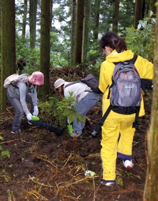 参加者達は、宮脇昭・(財)国際生態学センター研究所長(横浜国立大学名誉教授)の植樹指導を受けた後、植樹場所に移動。約百名の植樹リーダーの手伝いの下、それぞれ十本づつ苗木を植えた。