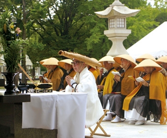 七月十四日、広島平和記念公園において開宗千二百年慶讃大法会「戦歿者慰霊・世界平和の祈り」法華経読誦法要が、酒井雄哉大阿闍梨を導師として執り行われた(写真下)。