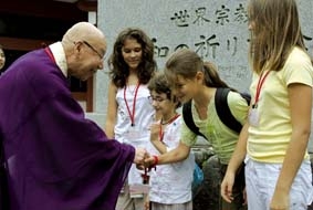午後からは会場を比叡山延暦寺根本中堂前広場に移し、「世界平和祈り式典」を開催。ボスニアと広島の子ども達により「世界平和の鐘」が打ち鳴らされたのを合図に、参加者全員が平和への黙祷、続いて半田孝淳名誉議長の挨拶の後、内外の諸宗教代表がそれぞれの宗教儀式に則り、祈りを捧げた。