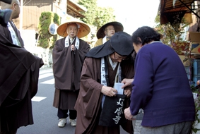 同日は、半田孝淳天台座主猊下を先頭に濱中光礼宗務総長、延暦寺一山住職、天台宗務庁役職員など約百名が参加、比叡山麓坂本地区を中心に一斉托鉢を実施した。托鉢は法楽の後、宗祖生誕の地・生源寺を出発、坂本地区の里道を般若心経を唱えながら行脚。道筋の家々の玄関先には既に一行が来るのを待っておられる方々も多く、ねぎらいの言葉とともに貴重な浄財を喜捨されていた。その後、参加者たちはそれぞれ少人数に別れ、坂本地区内を戸別に廻ったり、JRや私鉄の駅前で街頭募金を行い、多くの人々から善意を受け取った。