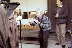 訪れた家々の玄関先では、浄財を持って待っている人も多く、座主猊下の姿を見ると、駆け寄って合掌し、ねぎらいの言葉と共に浄財を喜捨、座主猊下も「温かいお気持ちを有意義に使わせて頂きます」と感謝の意を表されていた。