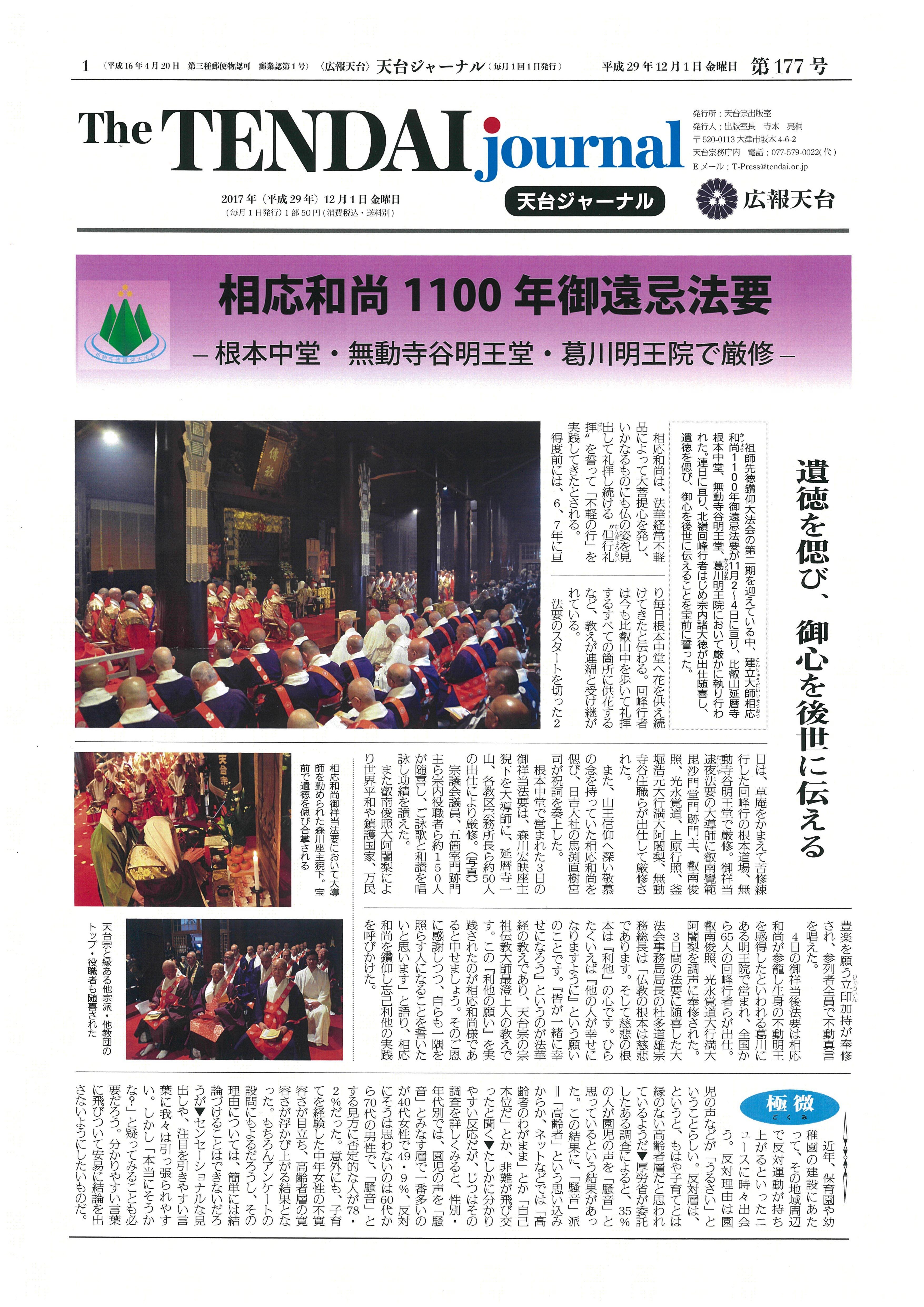 祖師先徳鑽仰大法会の第二期を迎えている中、1100年御遠忌法要が11月2〜4日に亘り、比叡山延暦寺根本中堂、無動寺谷明王堂、明王院において厳かに執り行われた。連日に亘り、北嶺回峰行者はじめ宗内諸大徳が出仕随喜し、遺徳を偲び、御心を後世に伝えることを宝前に誓った。