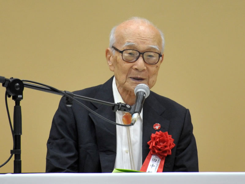▲「平和を語る」にて講演する田中煕巳代表委員 「世界平和祈りの集い」が13時より細野舜海宗務総長の挨拶で開式した。 次のプログラム「平和を語る」では、「核兵器も戦争もない人間社会を」と題し、日本原水爆被害者団体協議会(日本被団協)より代表委員である田中熙巳氏を講演者に招いた。 日本原水爆被害者団体協議会は、原爆が投下された1945年から11年後の1956年に結成され、核兵器の廃絶や被害者の救済を訴える活動を続けてこられた。長年にわたる被爆者たちによる地道な活動が、核兵器のない世界を目指して尽力し、核兵器が二度と使われてはならないことを、証言を通じて世界に示してきたことなどが評価され、2024年にノーベル平和賞を受賞された。 現今の世界では自国第一主義が頭をもたげ、グローバル社会における分断が深まりつつある。このような状況から、田中氏は世界が再び核兵器を使った戦争を起こすのではないかとの危機感を抱いておられ、核兵器を地球上からなくすためには、被爆者が目撃したことや体験した事実を通じて世界へ伝えることが最大の方法であるとの考えを示された。また戦争を知らない若者に対しては、「子どもが小さい時から人を愛し、平和を愛する心を育てていく努力をし、未来において核戦争が絶対に起こらないようにしてほしい」と話された。最後に「人の心の安寧を一番願い、作ってくださっている宗教者の皆さん方の努力に対して、がんばっていただきたいと心から願っている」と会場に集まった多くの宗教者たちに期待を寄せて締めくくられた。講演後の質疑応答では多数の質問があり、関心の高さが伺えた。 また、公益財団法人日本ユニセフ協会への支援金寄託式では、細野総長より参加者への記念品相当額の支援金寄託について趣旨説明が行われ、参加者からの賛同を求めた。参加者よりあたたかい拍手の賛同を得て、世界の子どもたちの福祉と教育支援金として、日本ユニセフ協会専務理事である早水研氏に目録が手渡された。また早水氏からは、「世界平和と子どもたちの安全と健全な成長を祈って、これからも祈りの輪を広げていただきたい」と感謝状が贈られた。 平和の祈り 於 一隅を照らす会館前「祈りの広場」