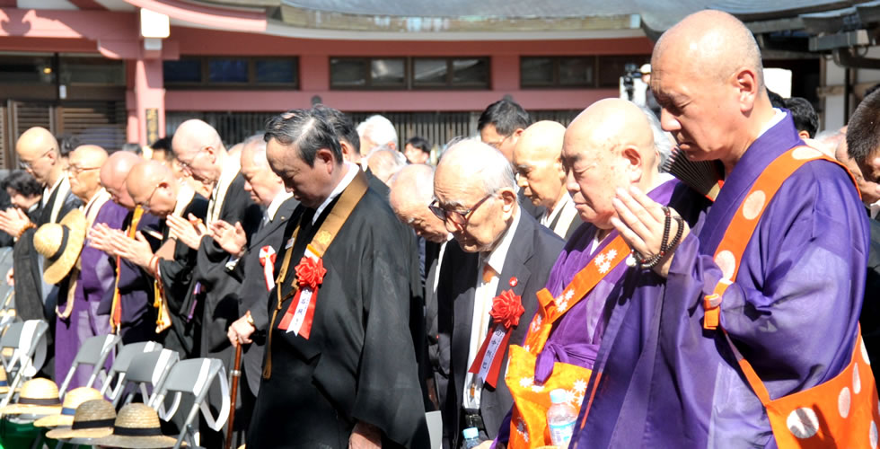▲ 祈りを捧げる参加者 15時20分からは会場を屋外に移し、一隅を照らす会館前「祈りの広場」にて実施された。 はじめに、次世代を担う宗教者代表として神社神道より戸内結律子師、仏教より犬山空翼師の2名が登壇し1987年の比叡山宗教サミット「世界宗教者平和の祈りの集い」において採択された『比叡山メッセージ』の朗読が行われた。 そして、定刻の15時30分には各教宗派・団体を代表し祈りを捧げるべく、教派神道連合会を代表し出口紅師、全日本仏教会を代表し村山廣甫師、日本キリスト教連合会を代表し大塚喜直師、神社神道を代表し田中恆清師、新日本宗教団体連合会を代表し石倉寿一師、日本ムスリム教会を代表し柏原良英師、世界宗教者平和会議(WCRP)日本委員会を代表し戸松義晴師、世界連邦日本宗教委員会を代表し宍野史生師、ローマ教皇庁駐日大使フランシスコ・エスカランテ・モリーナ閣下、主催者代表として藤光賢天台座主猊下の10名が登壇。そして天台仏教青年連盟の甲斐健盛代表と清水信秀副代表、裄V最一副代表が撞く「世界平和の鐘」の音に合わせて参加者一同は心をひとつにして平和への祈りを捧げた。