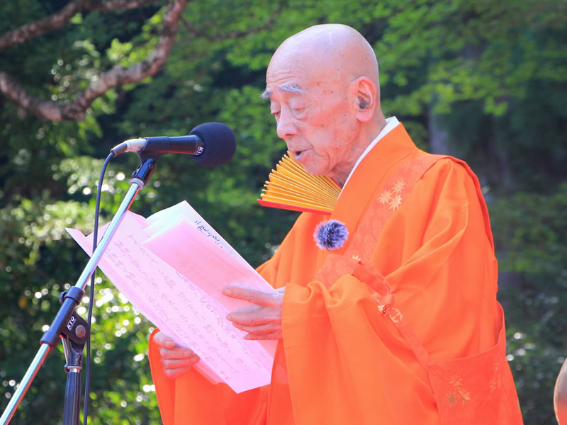 ▲藤光賢天台座主猊下による主催者代表挨拶 また、藤座主猊下が主催者を代表し「私たちはあらゆる兵器や暴力のない、慈愛に満ちた社会の実現に邁進いたします」と述べられた。 その後、日谷照應全日本仏教会理事長が、世界仏教徒連盟(WFB)パロップ・タイアリー会長からのメッセージを、モリーナ大使がローマ教皇庁諸宗教対話省ジョージ・ジェイコブ・クーバカド長官からのメッセージをそれぞれ代読した。 最後に獅子王圓明延暦寺執行より閉式の挨拶があり、比叡山宗教サミット38周年「世界平和祈りの集い」は閉会となった。 |